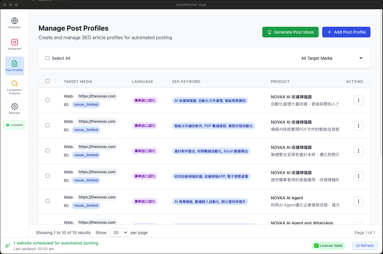 Transform your WordPress website and Instagram presence into a lead-generating machine with AutoPoster Desktop, developed by NOVAX Limited. This powerful, user-friendly desktop application automates and optimizes your SEO and social media strategy to boost organic traffic, improve search engine rankings, and attract more clients effortlessly. With a one-time license, you gain lifetime access to AI-driven marketing research and content creation tools designed specifically for WordPress websites and Instagram accounts.